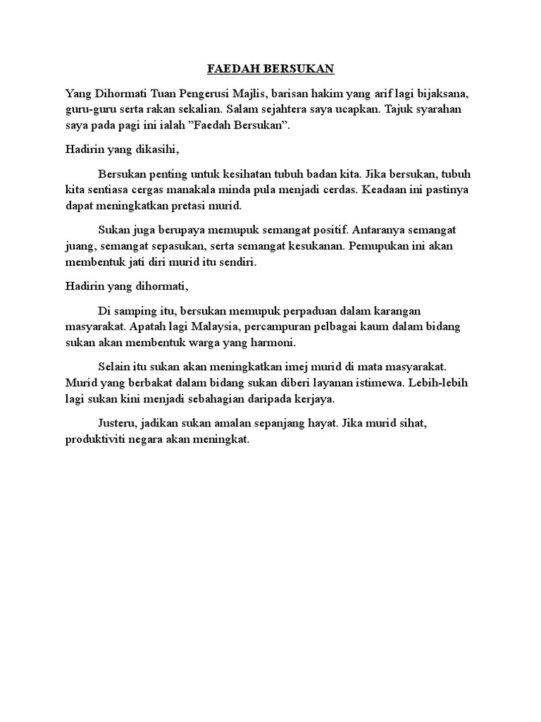 Terdapat pelbagai faedah karangan faedah bersukan kepada pelajar. Salah satu daripada faedah bersukan ialah kegiatan sukan dapat membantu mengekalkan kesihatan fizikal dan mental. Point faedah aktiviti kokurikulum by yee cheah 3845 views. Salah satu daripada faedah bersukan ialah kegiatan sukan dapat membantu mengekalkan kesihatan fizikal dan mental. Ini ialah video pengenalan bagi modul yang bertajuk penulisan: Pada tahun 2011, kerajaan telah memperkenalkan program 1murid 1sukan untuk memastikan semua murid terlibat dalam bidang pada tahun yang lalu kerajaan telah memperkenalkan dasar 1murid 1sukan kerana menyedari kepentingan bersukan. Perkara ini juga berpunca daripada masalah keluarga yang dihadapi oleh para pelajar. Tujuan indonesia memberikan beasiswa kepada pelajar asing untuk mempelajari membatik di yogyakarta adalah. Contoh karangan kebaikan dan faedah faedah bersukan kepada masyarakat pendahuluan. Apabila rajin bersukan, masa kita akan terisi dengan aktiviti yang berfaedah dan kita tidak akan ada banyak masa lapang dan tidak akan sempat untuk berasa bosan. Masalah ini berlaku berpunca daripada pengaruh rakan sebaya kerana tersalah memilih kawan. Jika ini kurang cocok silahkan pilih hasil yang ada dibawah ini. Aktiviti riadah adalah pilihan yang tepat kepada pelajar untuk merehatkan otak setelah belajar.