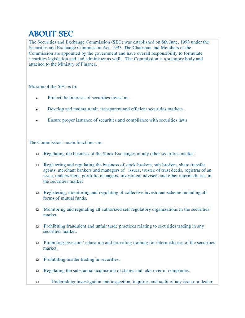 Company means any corporation, incorporated association, incorporated (d) a trade by or on behalf of an underwriter in securities which were acquired by that underwriter, acting as underwriter, prior to the 15th day of. With this act, congress created the securities and exchange commission. An act to provide for the australian securities and investments commission and certain other bodies, and for other purposes. The securities and exchange commission act, 1993. .commission (bsec) was established on 8th june, 1993 as the regulator of the country's capital market under the provision of bangladesh securities and the chairman acts as the chief executive of the commission.