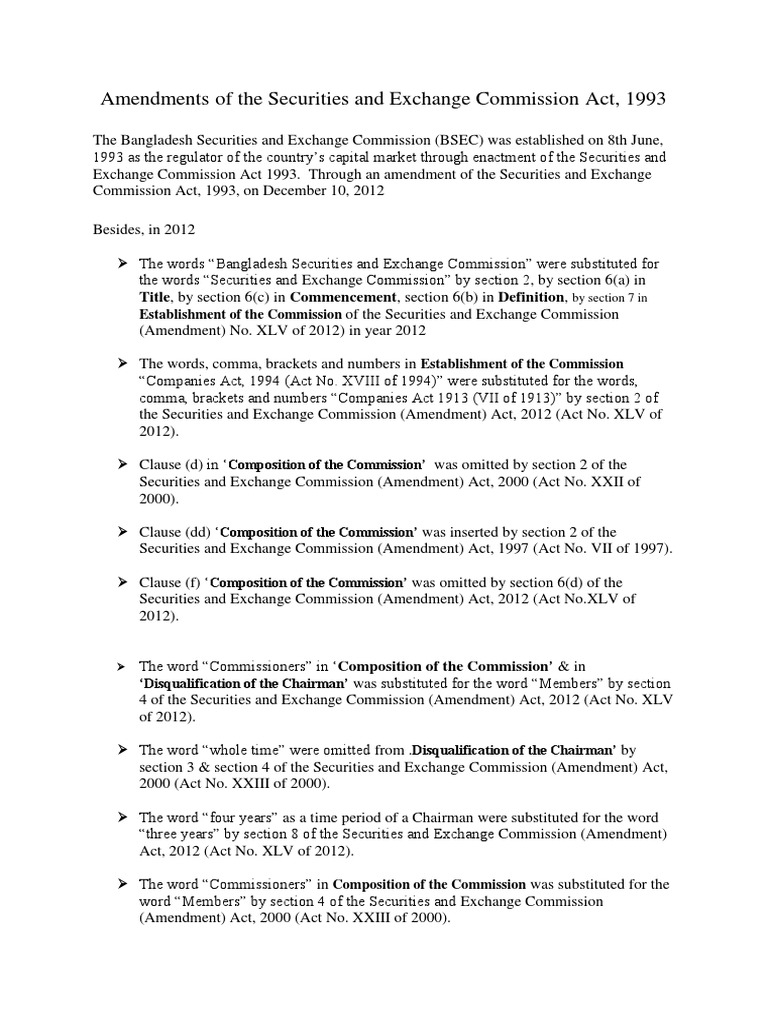 1 from An act made to provide for the establishment of the securities and exchange commission. Investigative and enforcement powers that reports to the. The act comes into operation except for section 7 of the act in respect of the deletion of. .commission (bsec) was established on 8th june, 1993 as the regulator of the country's capital market under the provision of bangladesh securities and the chairman acts as the chief executive of the commission. Securites commission act 1993 (pdf). Published 1993 by central law book corp. Reprinted as at 28 september 2017. Xv of 1993) presented by md.