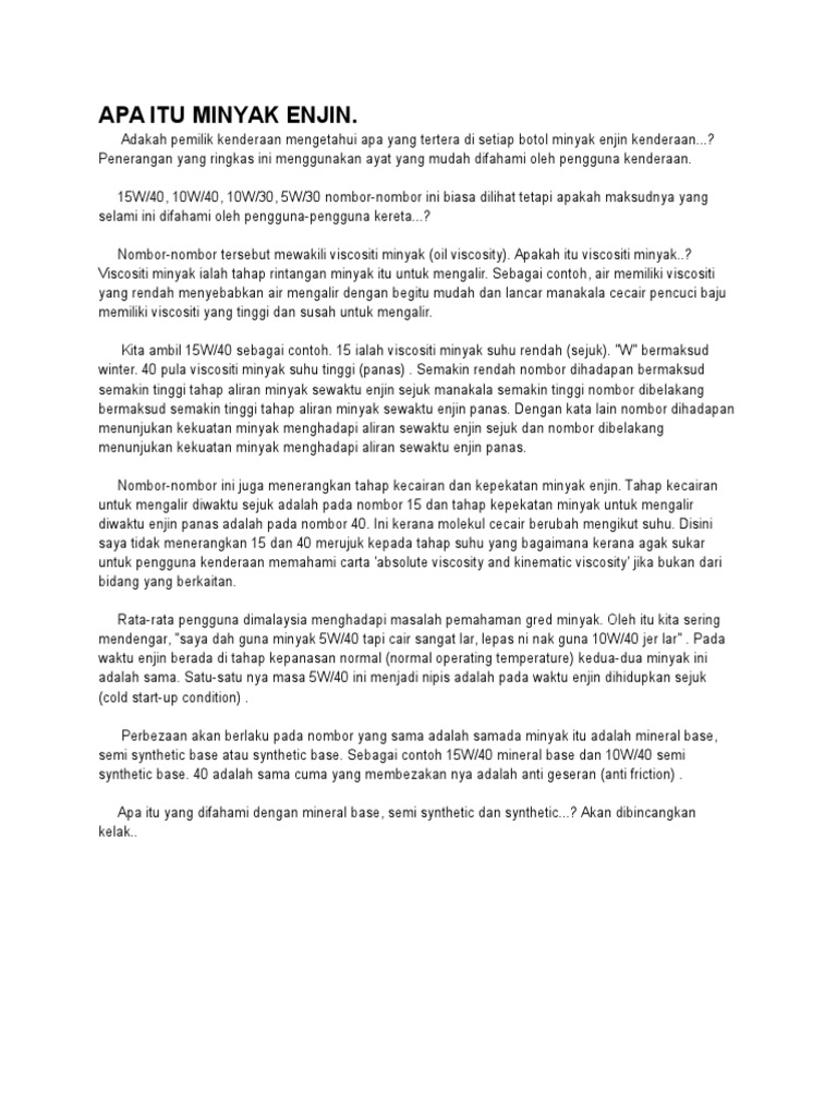 Minyak fully sintetik mempunyai additif yang melindungi seal dan komponen dalaman enjin. Mineral atau guna minyak semi sesuai untuk. Biar tahu minyak pelincir terbaik jangan tertipu. Sara fajira, aksara dena, seteng a. Ikut cara betul pilih minyak injin! Ia sangat bagus dan sesuai untuk mereka yang mahu menjaga komponen dalaman enjin untuk jangkamasa panjang (silinder, ring). Mineral, semi sintetik dan sintetik penuh. Selain itu minyak hitam fully syntetic. Minyak sintetik dan minyak mineral sama bagus! Mineral, semi, fully boleh digunakan 10,000km tanpa masalah. Minyak sintetik boleh membersihkan enapan minyak di penyendat yang mungkin menyekat retakan halus tidak benar. Ia juga mengandungi kandungan detergen yang tinggi yang dapat mencuci. Haaaa gini bang, secara umumnya, beza utama antara ketiga tiga jenis minyak ni adalah lebih kepada mileage saja.